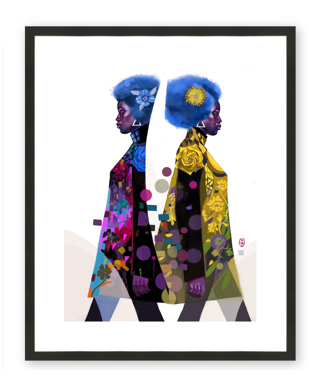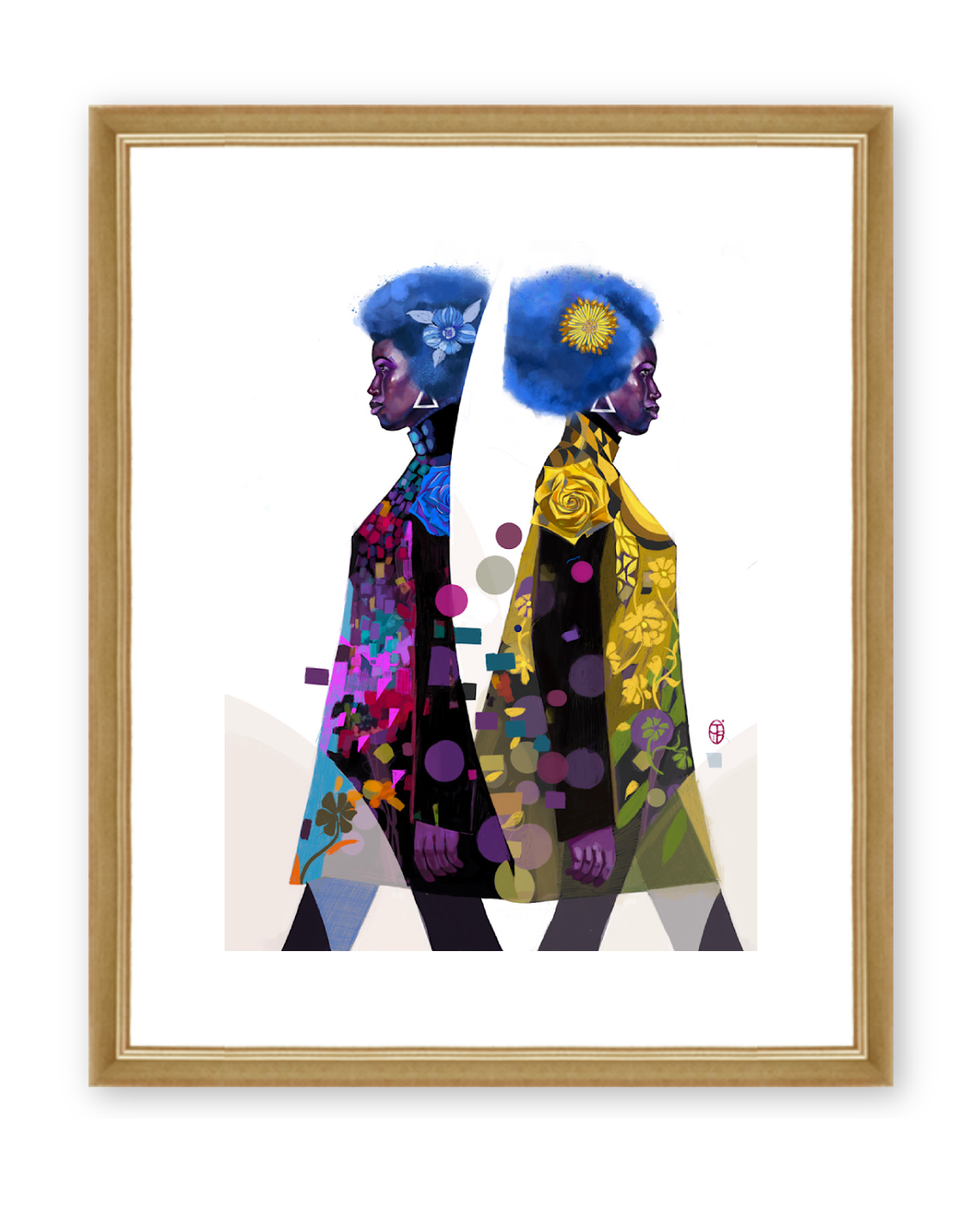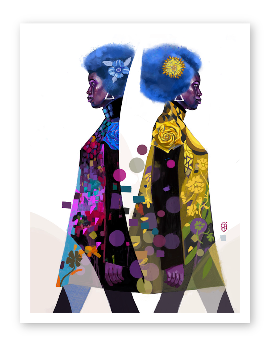 "A vibrant tribute to transformation, this artwork captures the moment of stepping out of the past and into a bright, hopeful future. The dual figures—mirrors where this woman has been and where she's going at the same time—stepping forward with a full heart, radiant colour, and fearless style. Blossoms, patterns, and glowing hues symbolize renewal, optimism, and the beauty of walking boldly into what’s next, carrying the past —but not regrets—into a new chapter of her choosing."